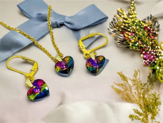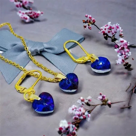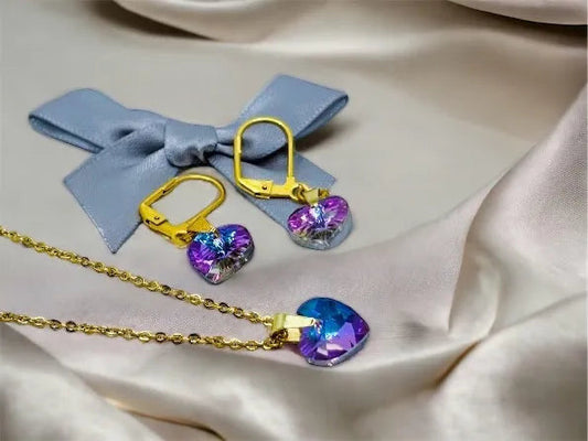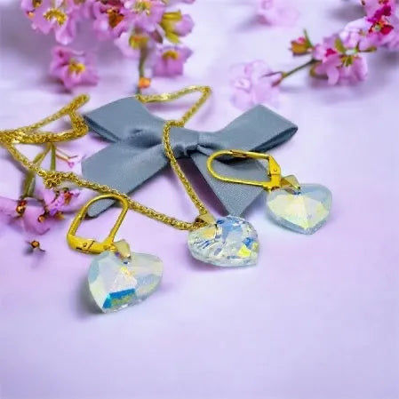 Set srdiečka S60 – Láska a elegancia Ručne vyrábaná súprava náušníc a retiazky s kryštálmi v tvare srdiečka a chirurgickou oceľou v zlatom prevedení Kolekcia: Klenoty Slovanov
