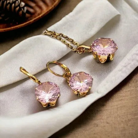 Zlatý set z chirurgickej ocele – náušnice a prívesok s ružovými kamienkami set s ružovými kamienkami v zlatom prevedení 1002330