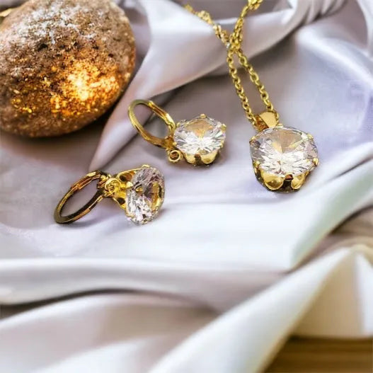 Gold surgical steel set - dangle earrings and pendant with crystal stones set with white stones in gold design 1002327