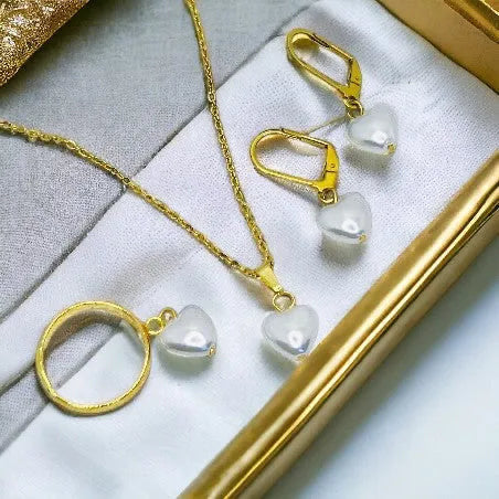 Pearl Set S70 – Lela's Treasure Handmade set of earrings, ring and necklace with pearls and surgical steel in gold finish Collection: Jewels of the Slavs