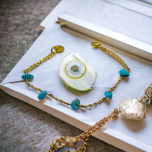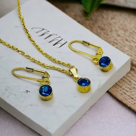 Set with blue stones S43 – Voice of the Sea Handmade set of earrings and pendant with blue stones and surgical steel in gold finish Collection: Jewels of the Slavs