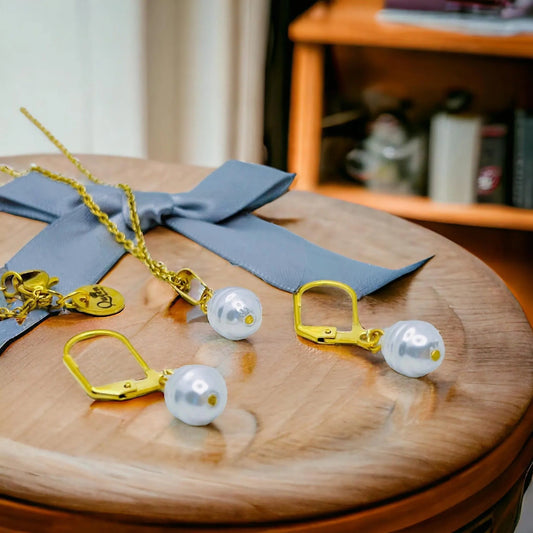Pearl Set S70 – Lela's Treasure Handmade set of earrings, ring and necklace with pearls and surgical steel in gold finish Collection: Jewels of the Slavs