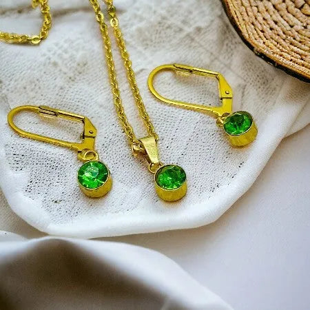 Set with green stones S42 – Spring touch Handmade set of earrings and pendant with green stones and surgical steel in gold finish Collection: Jewels of the Slavs