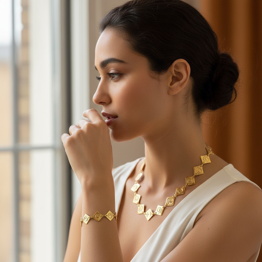 The bracelet and necklace made of high-quality surgical steel in a gold finish are decorated with spiral links in the shape of diamonds - each like a small solar disk. They are easy to wear, but they carry power - the power of balance, renewal and harmony.