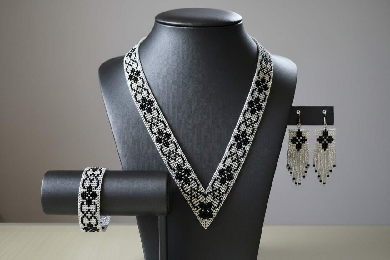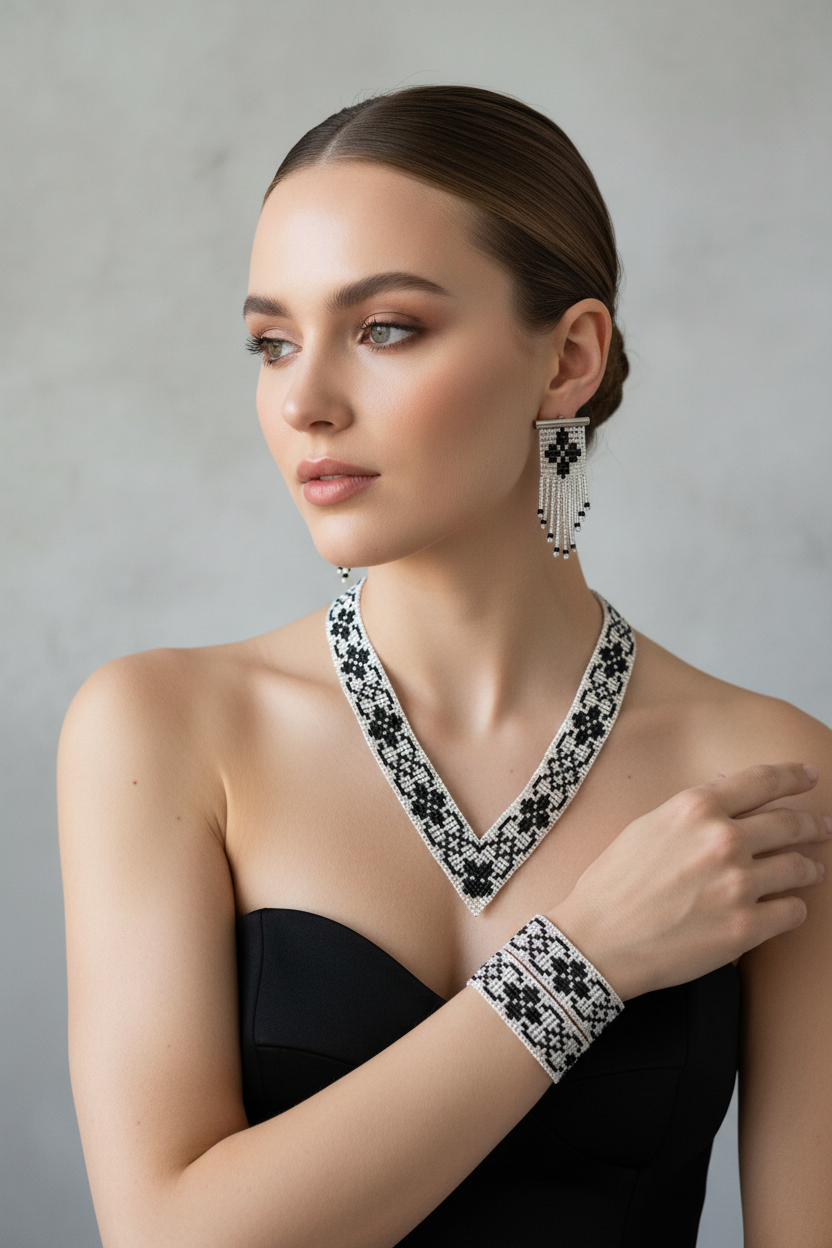 Geometric motifs symbolize balance, continuity of lineage and connection with the earth . The white background brings purity and light, the black pattern grounding and stability. The jewelry is ideal for women who love natural elegance, tradition and timeless style.