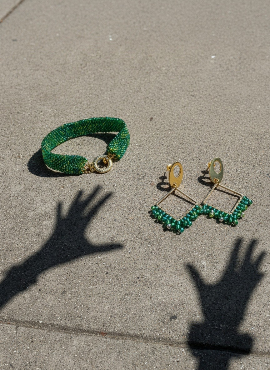 V zelenom trblietaní tohto setu sa ukrýva sila lesa, pokoj rieky a jarná energia prebúdzajúcej sa zeme. Náramok s jemne prepletanými korálkami hrá všetkými odtieňmi smaragdu a tyrkysu, pripomínajúc lístie, ktorého sa dotýka slnko. Zlaté zapínanie mu dodáva noblesu a ženskú žiaru. Náušnice s geometrickým rámom a drobnými korálkami sa pohybujú s každým krokom – ako listy v tanci vetra.
