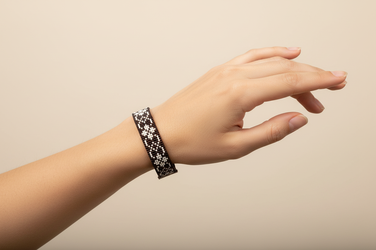 Ručne tkaný čierno-biely náramok nesie jemný vzor pripomínajúci tradičné ochranné znaky našich predkov. Kontrast svetla a tmy tu nepredstavuje protiklady, ale rovnováhu – pokoj vnútri a silu navonok.