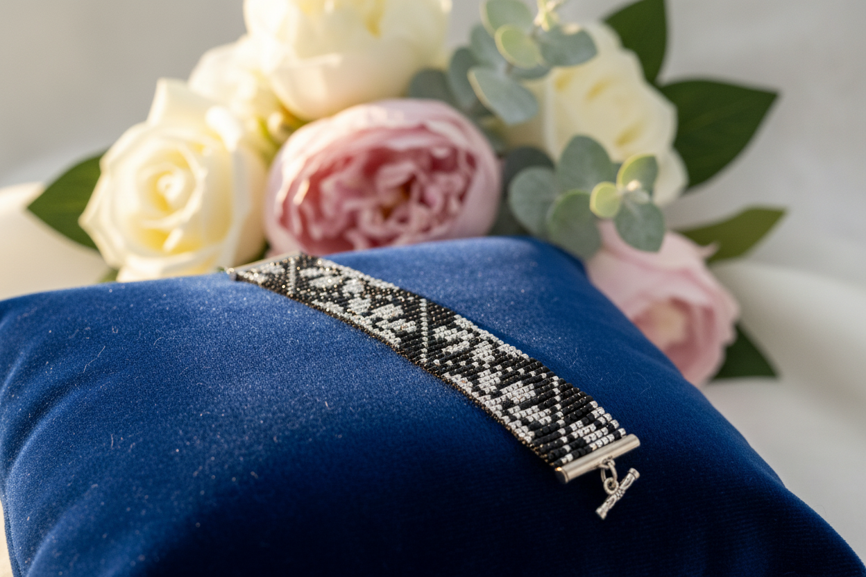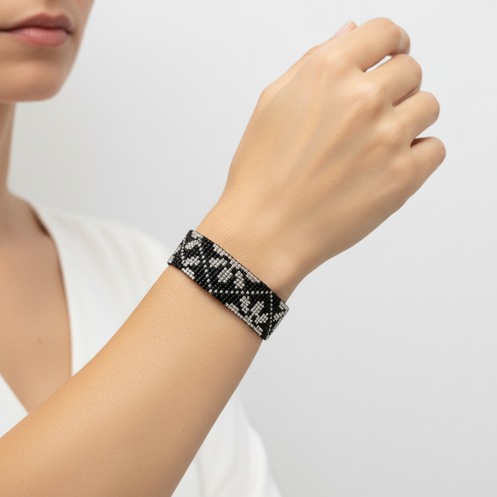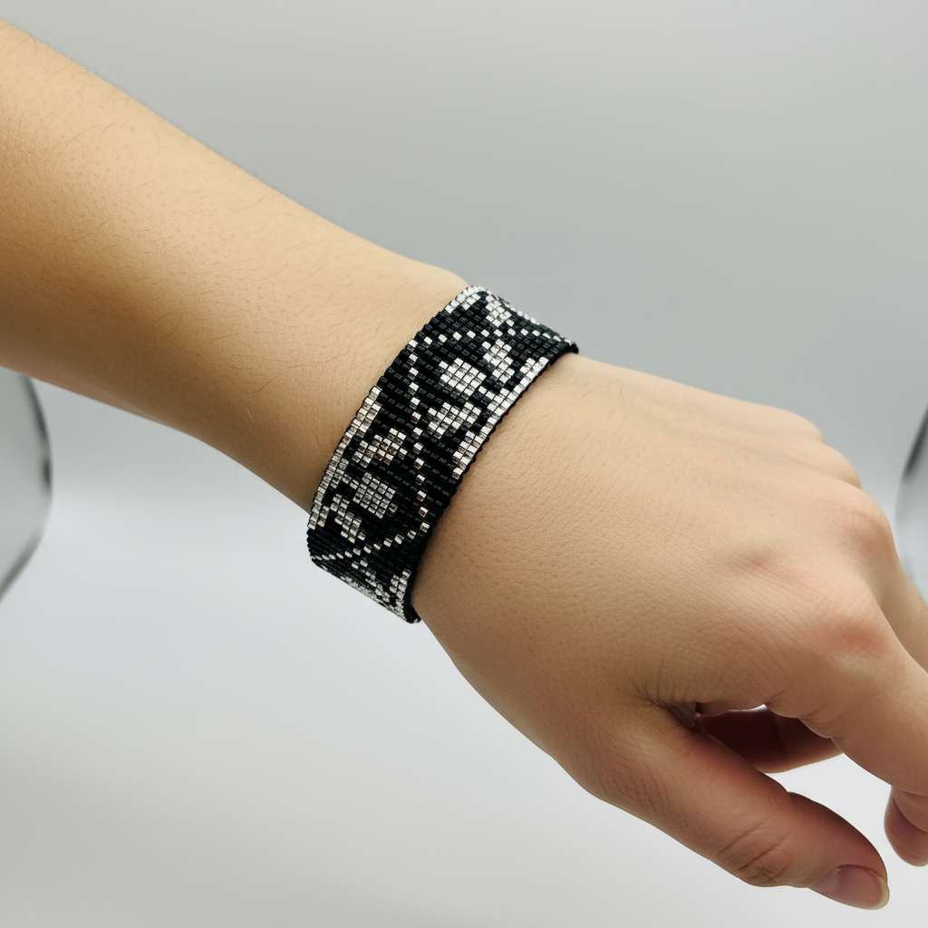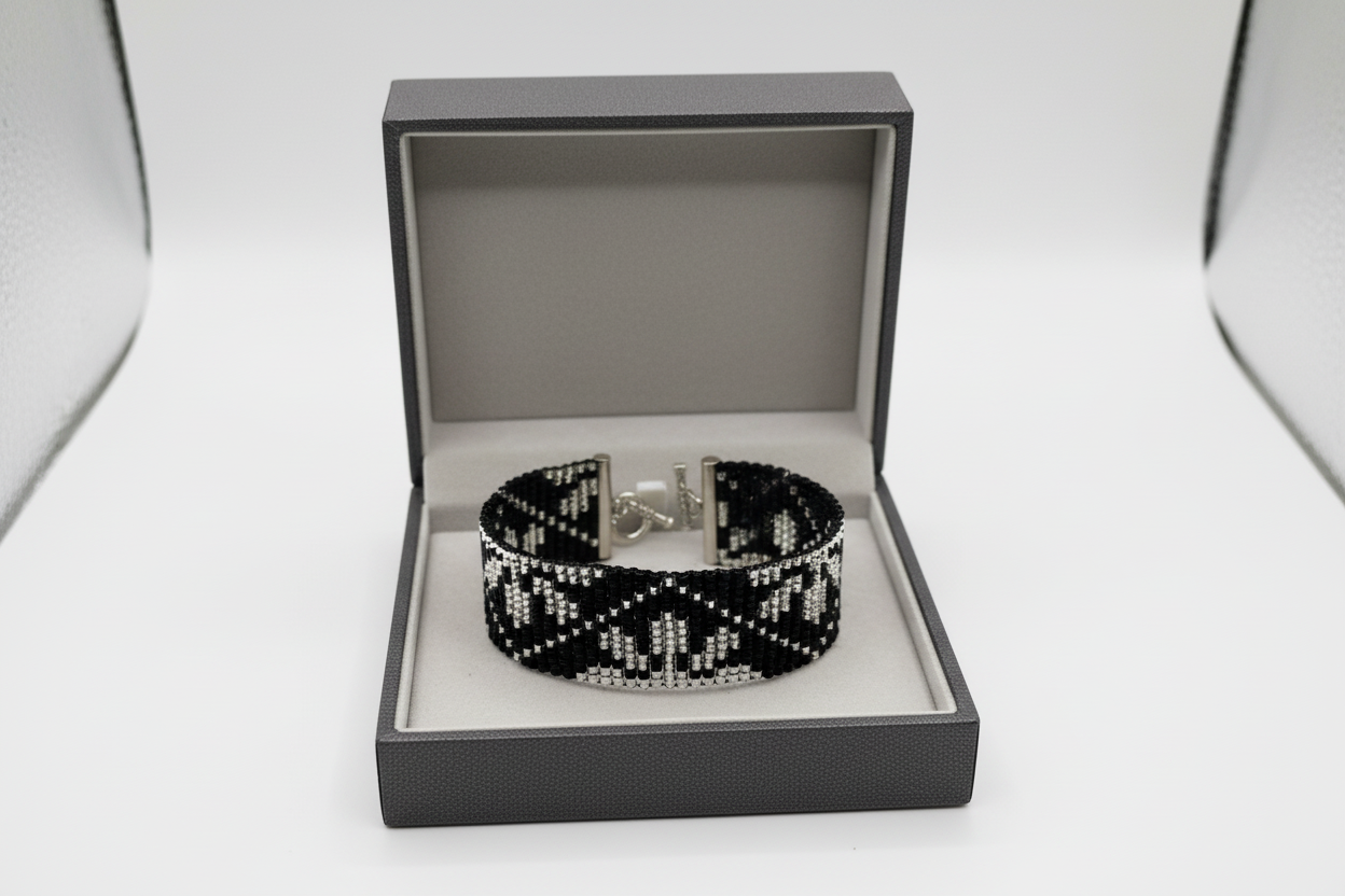 Tento ručne šitý náramok z korálok v čierno-striebornom prevedení vzniká precíznou technikou tkania, kde každý drobný korálik nachádza svoje presné miesto. Výsledkom je harmonický geometrický vzor, ktorý pôsobí moderne, elegantne a nadčasovo.