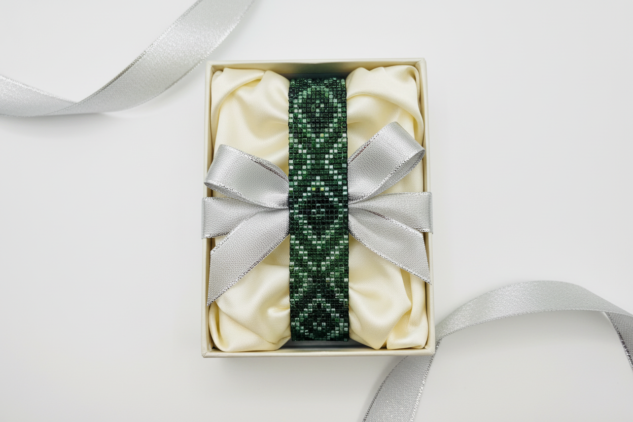 Tento ručne tkaný náramok v hlbokej tmavozelenej až takmer čiernej farbe v sebe nesie energiu lesa – ticho, stabilitu a prirodzenú ochranu. Jeho jemný vzor pôsobí nenápadne, no má silnú, uzemňujúcu prítomnosť.