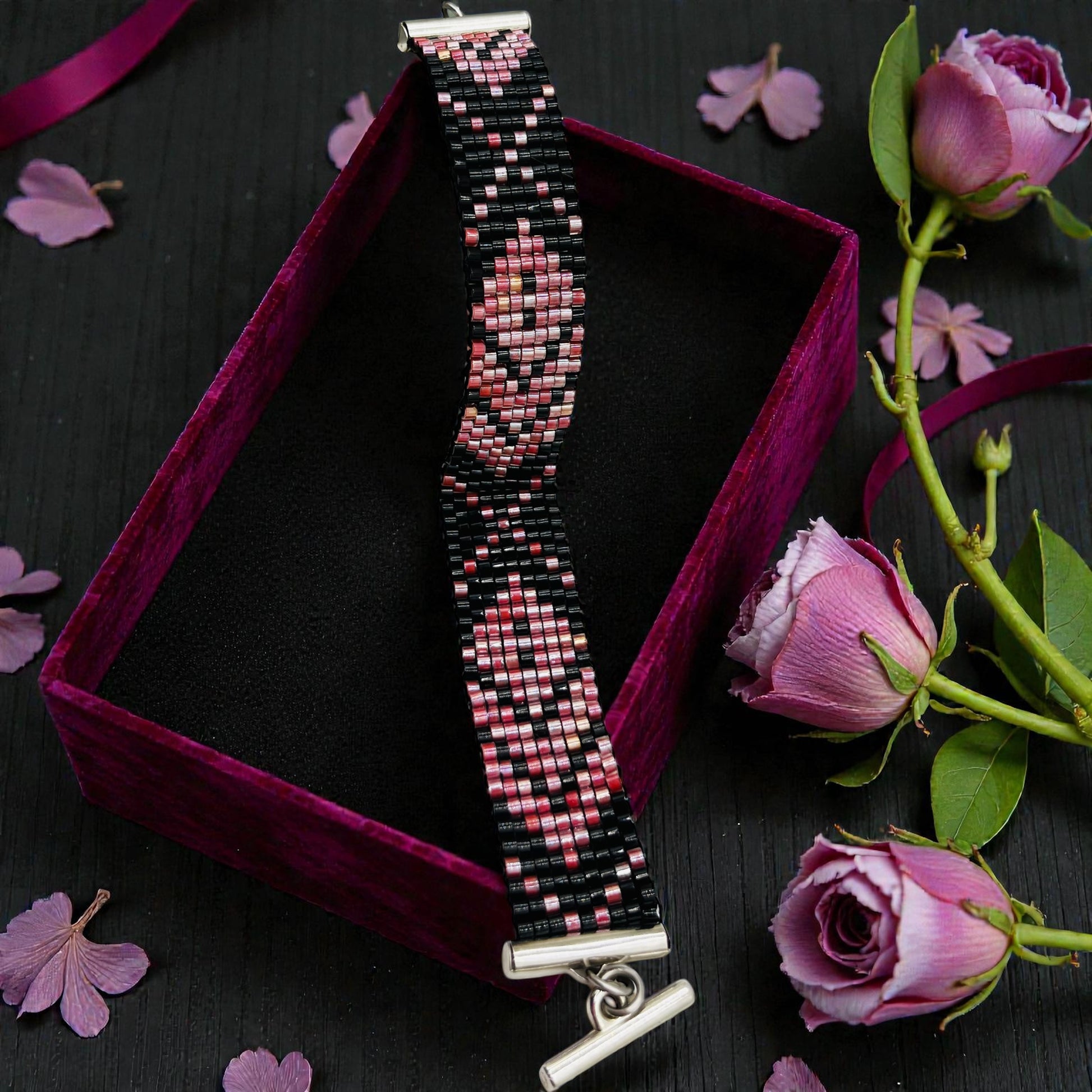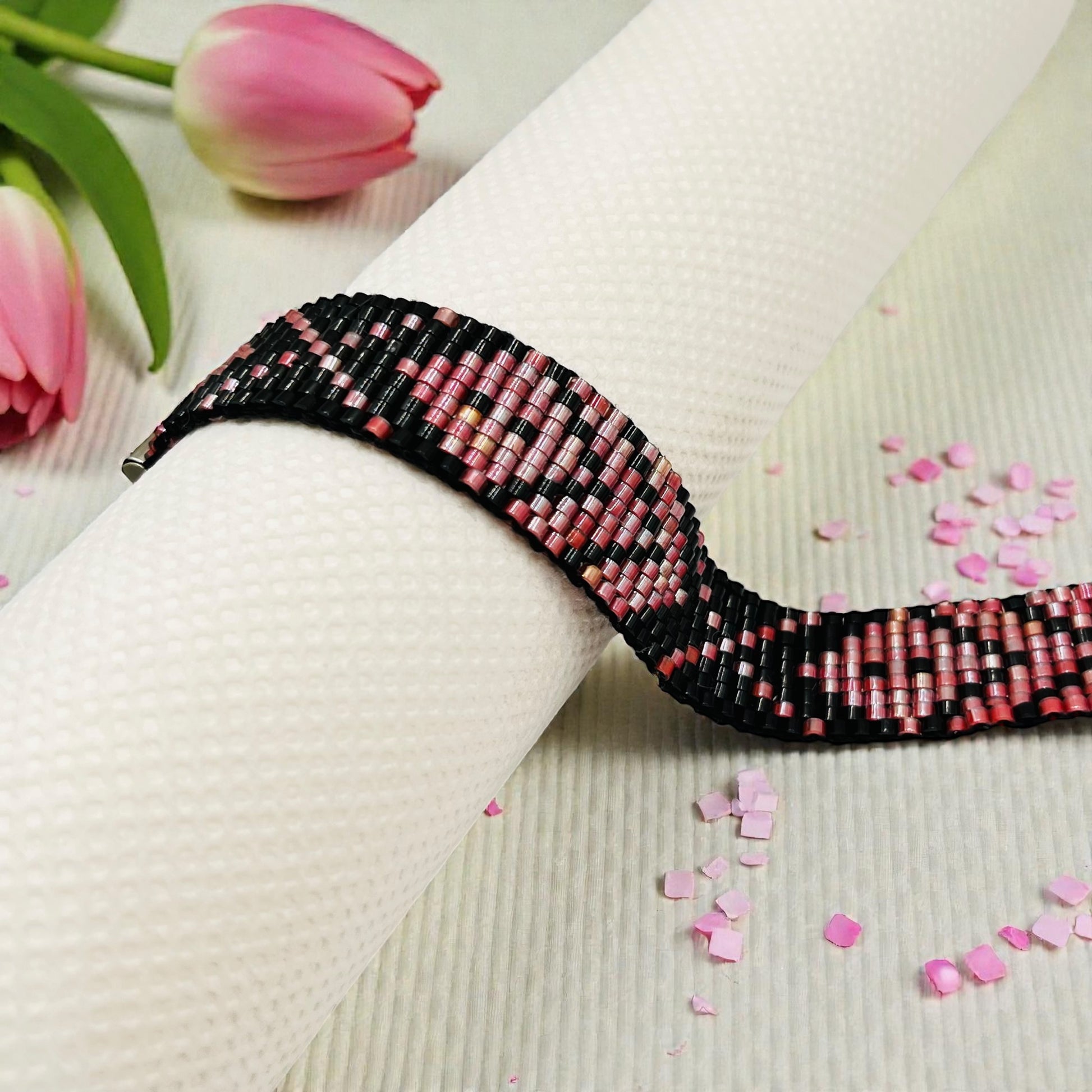 Tento ručne tkaný náramok vznikal pomaly, v tichu a sústredení. Každá drobná korálka bola uložená s úmyslom – pre rovnováhu, krásu a ženskú silu. Hlboká červená sa v ňom prelína s ochrannou čiernou, ako vášeň s pokojom, ako oheň s nocou.